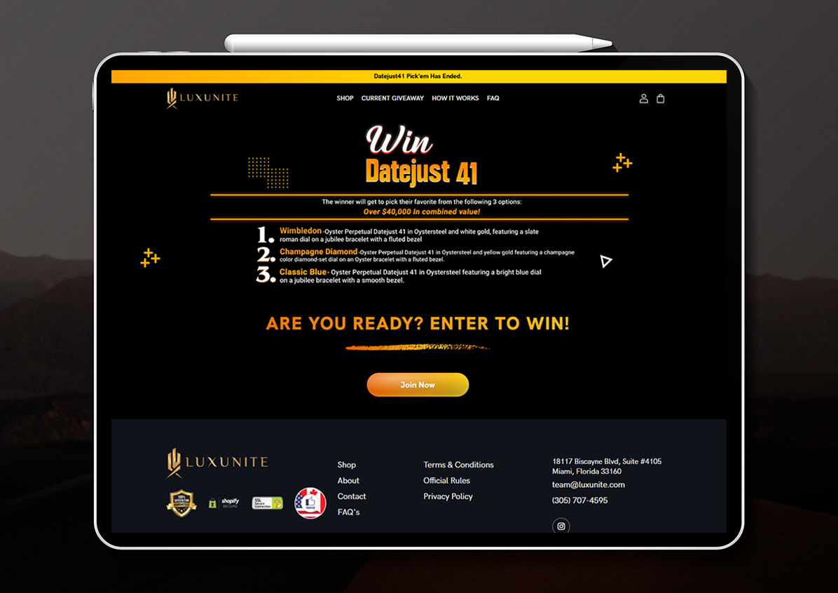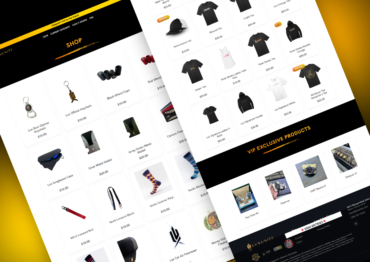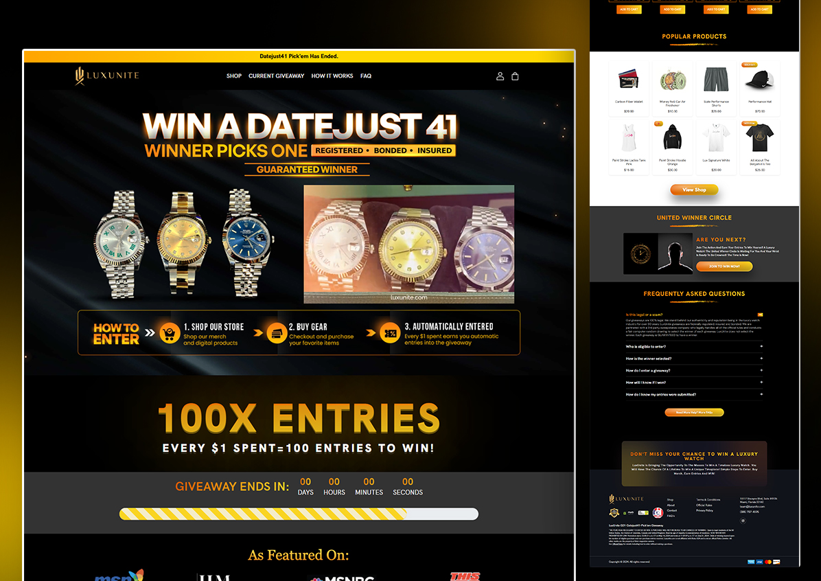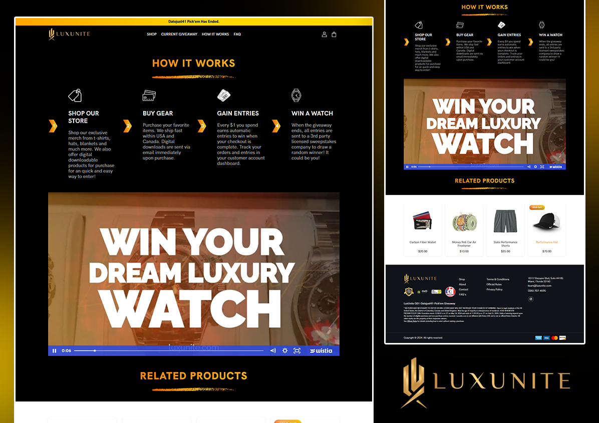 LuxUnite is a high-end product brand offering luxury items through exclusive giveaway campaigns. Customers buy premium products — and with each purchase, they receive free tickets for a chance to win cash or luxury gifts in scheduled raffle draws.